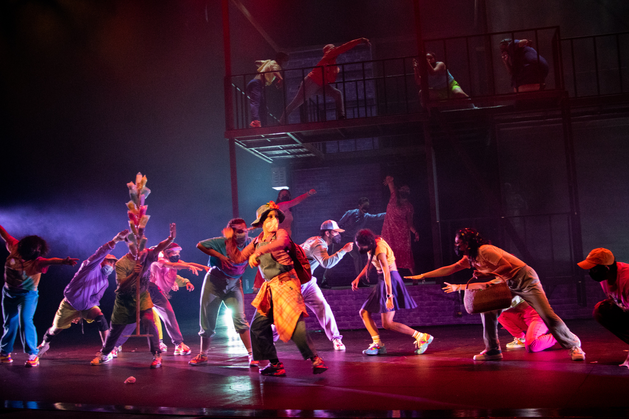 En el escenario transformado en un barrio de “La Gran Manzana”, dos raperos improvisan versos y rimas para acompañar -a forma de narradores rítmicos– a los bailarines, quienes con coloridos vestuarios y tenis diseñados por elles mismes, dejan fluir sus mejores pasos, al tiempo que se lucen individualmente.
